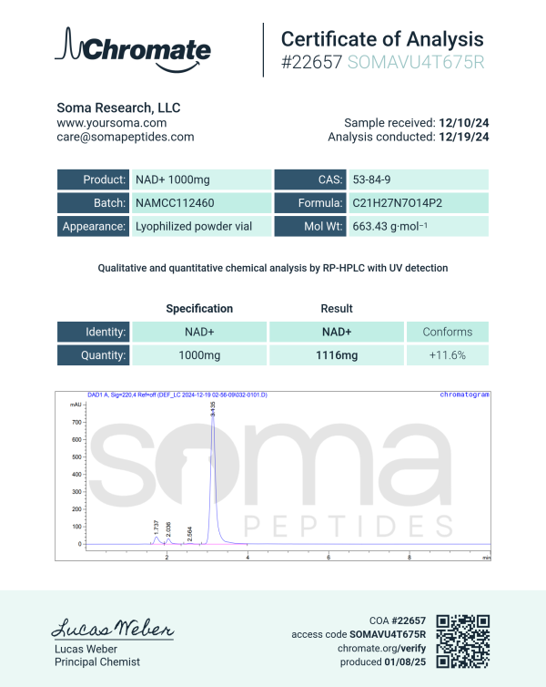Preclinical and clinical research suggests that NAD⁺ is involved in pathways related to cellular repair, oxidative stress regulation, and genomic stability. It serves as a substrate for enzymes such as sirtuins and PARPs, which are associated with DNA repair signaling and metabolic adaptation. These mechanisms are believed to contribute to its observed role in studies examining aging-related pathways, mitochondrial function, and cellular resilience under metabolic stress.